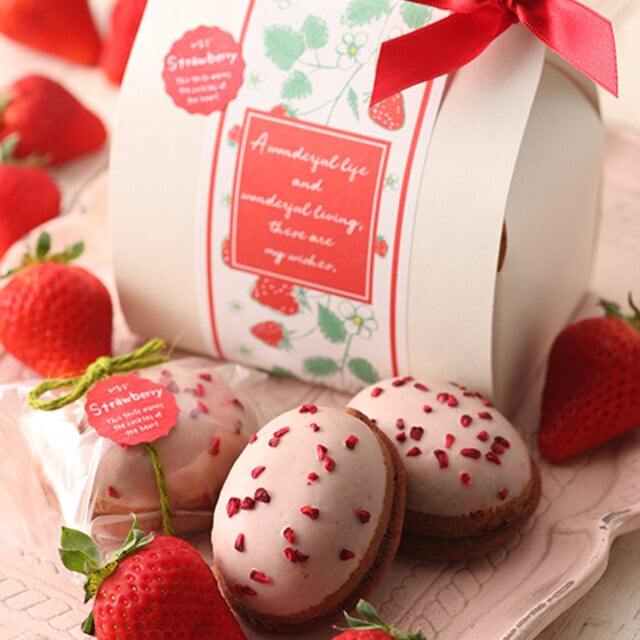 ふんわり焼き上げたいちご生地に、甘酸っぱいストロベリーフィリングとドライストロベリーをたっぷり忍ばせ、仕上げにいちごのチョコレートでやさしくコーティング。春だけの贅沢な焼き菓子です。ティータイムのおともに、大切な方へのギフトに。
