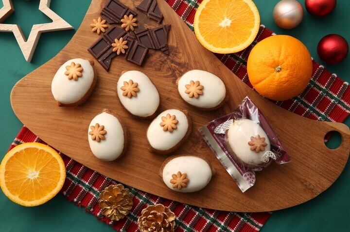 オレンジピールとクルミを贅沢に入れ、雪をイメージしてホワイトチョコでコーティングしました。ショコラとオレンジのハーモニーをお楽しみください。